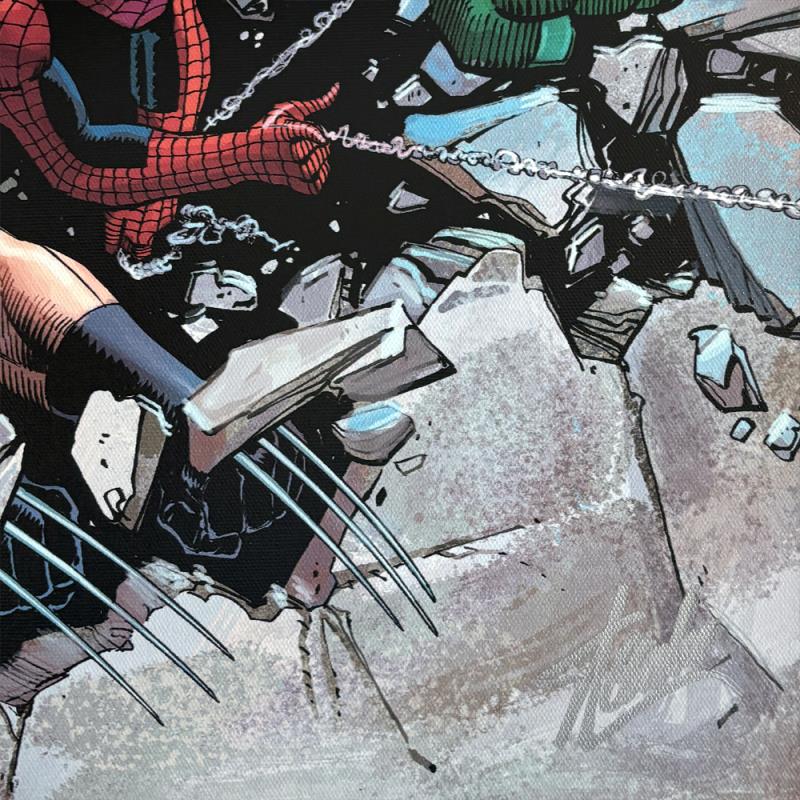 "Son of Marvel: Reading Chronology" is a limited edition giclee on canvas with art by John Romita Jr.. Officially licensed by Marvel, this piece is numbered 2/10 and hand signed by creative legend Stan Lee (1922-2018). Refer to second image for the signature as it appears on this piece. The piece comes with a certificate of authenticity. Measures approximately 18" x 24".