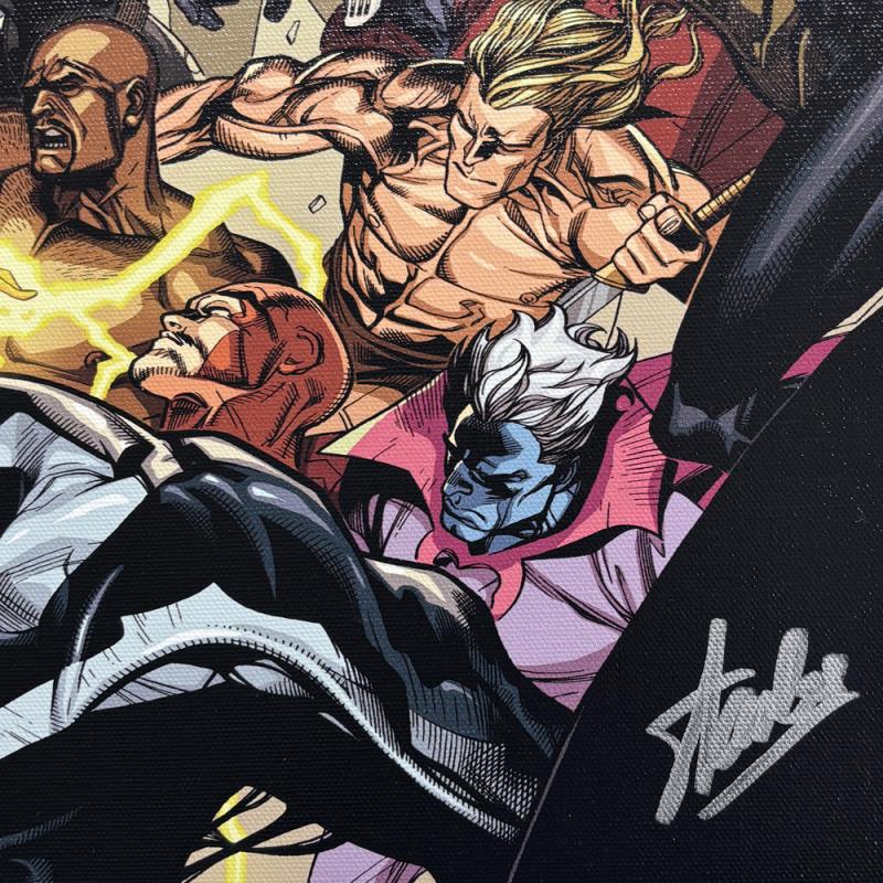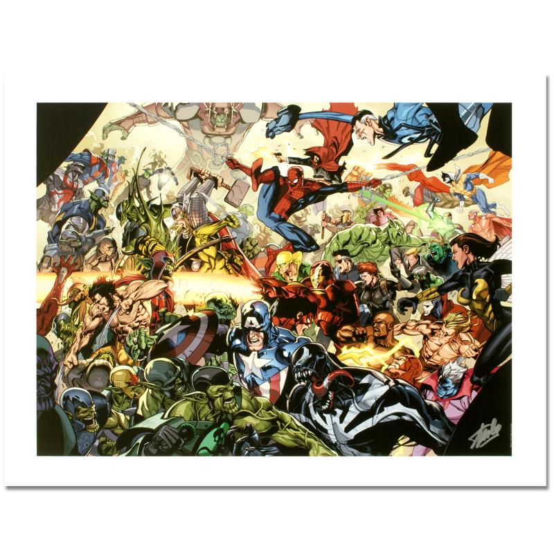 "Secret Invasion #6" is a limited edition giclee on canvas with art by Leinil Francis Yu . Officially licensed by Marvel, this piece is numbered 8/10 and hand signed by creative legend Stan Lee (1922-2018). Refer to second image for the signature as it appears on this piece. The piece comes with a certificate of authenticity. Measures approximately 18" x 24".