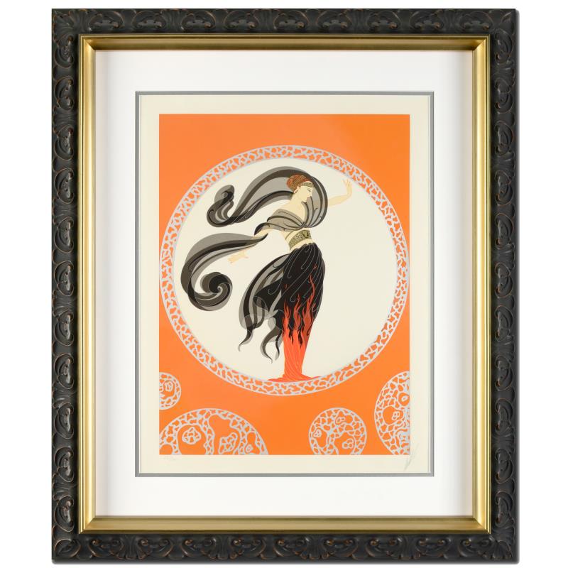 Known as "The Father of Art Deco," Erte (1892-1990) and his immense talent have been recognized by art collectors through the ages. His clean lines and intricate designs are awe-inspiring. "Flames Of Love" is a limited edition serigraph on paper, numbered 227/300 and hand signed by the artist. This piece is custom framed using acid free materials and is ready to hang. Includes Certificate of Authenticity! Measures approx. 29.5" x 35" (with frame), 16" x 21.5" (image).