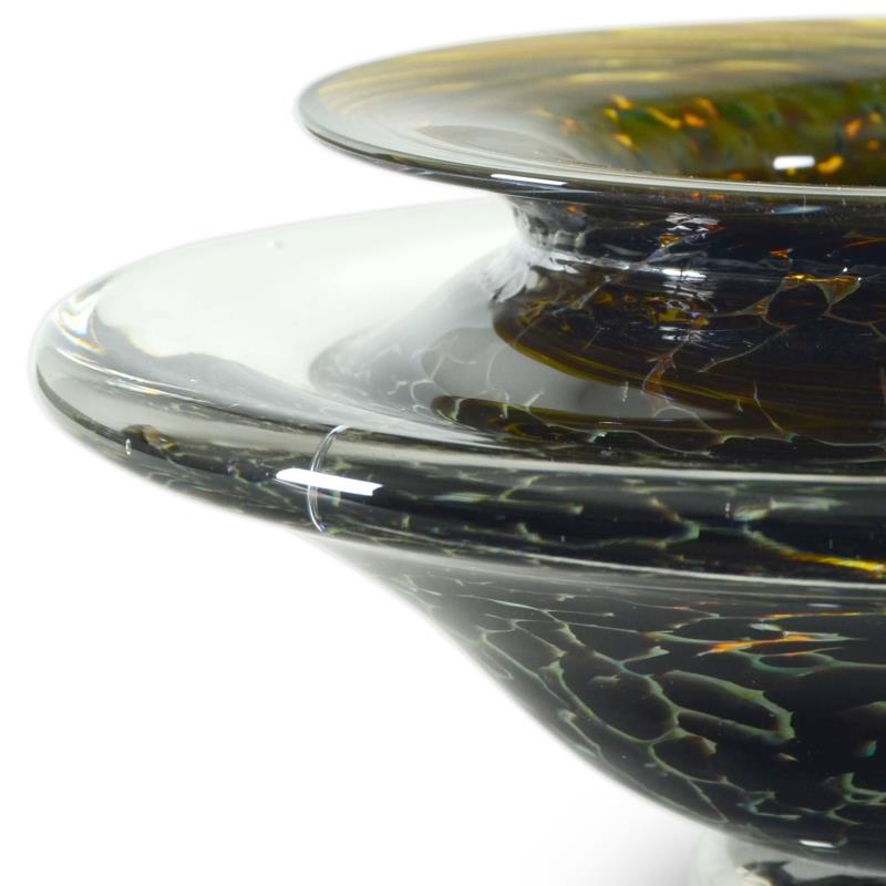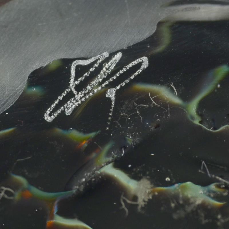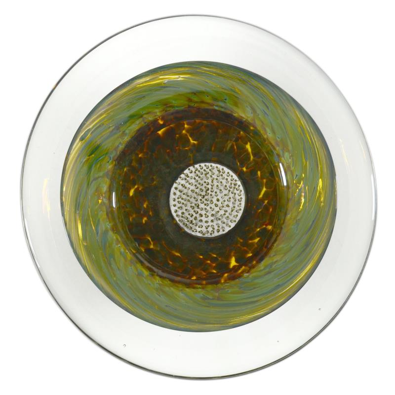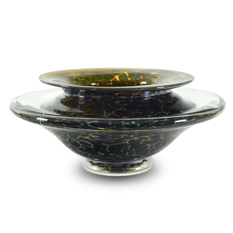 This hand blown glass "Medium Ikebana Flower Bowl" sculpture features a secured "Kenzan" spiked disc inside - the key to any fine Ikebana style flower arrangement. This one-of-a-kind flower bowl is hand signed by GartnerBlade Glass. Measures approx. 7" x 3.5" x 7"; 4lbs. (weight).