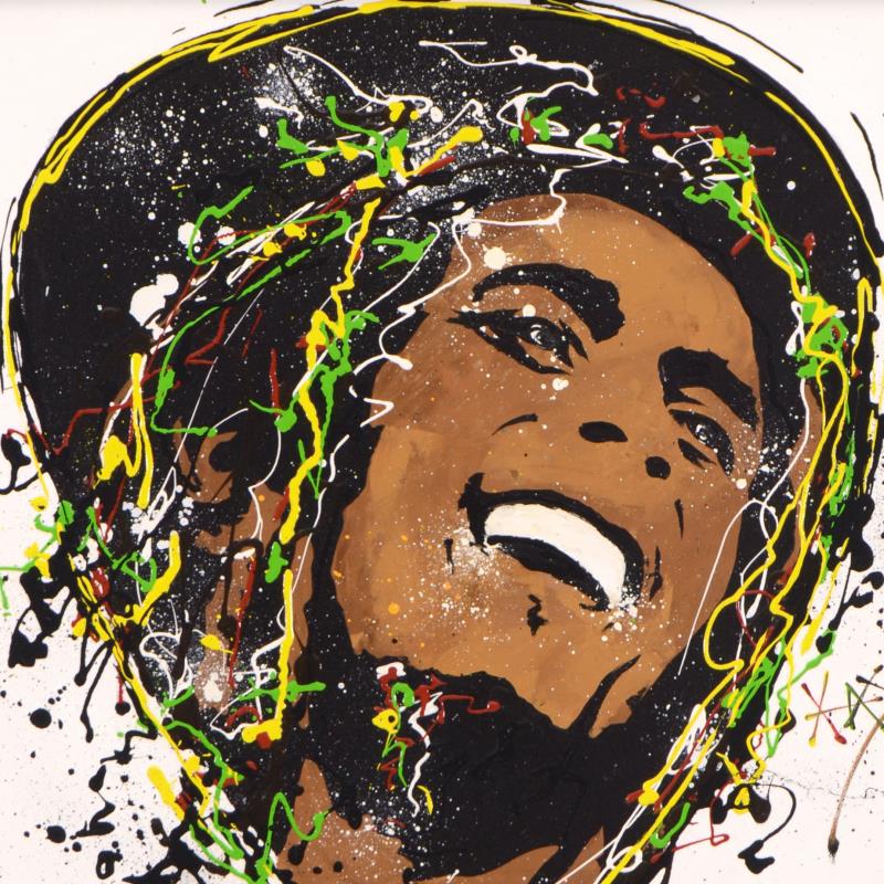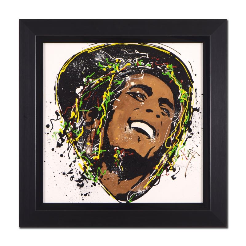 "Bob Marley - Pic Series" is an original acrylic painting on canvas by KAT, hand signed by the artist. This piece is custom framed. Includes Certificate of Authenticity. Measures approx. 25.5" x 25.5" (frame), 19.5" x 19.5" (image).
