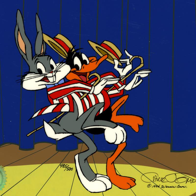 "Bugs And Daffy: Curtain Call" is a limited edition animation cel with hand painted coloring on sericel outline. The piece is numbered, hand signed by Chuck Jones (1912-2002), and includes a Certificate of Authenticity! Measures Approx: 12.5" x 10.5"