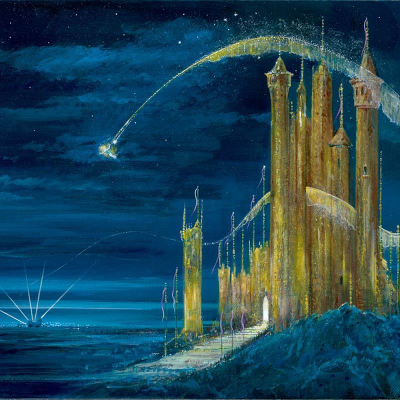 "Gold Castle" is a limited edition giclee on stretched canvas, numbered 170 out of 195 and hand signed by Harrison Ellenshaw! This piece is licensed by Disney Fine Art. Includes Certificate of Authenticity! Measures approx. 27" x 18" (image). ** Please note: there is a small vertical scratch to the left of the numbering. There is also minor wear to the corners and edges that may be concealed when framed. **