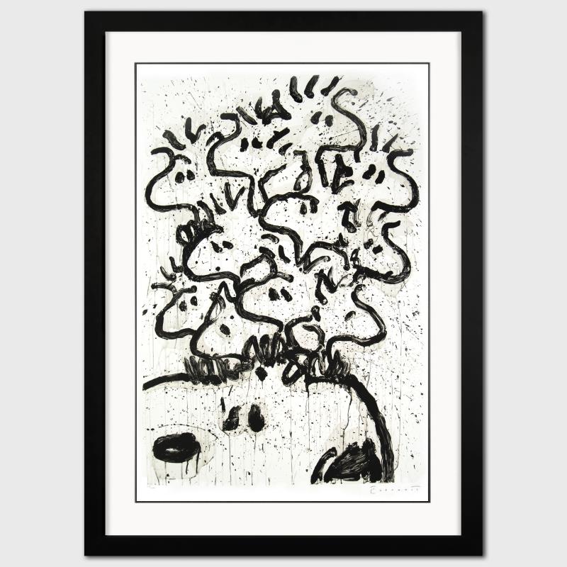 Master Artist Tom Everhart is the protege of famed "Peanuts" creator, Charles M. Schulz (1922–2000). As the only artist in the world granted the rights to draw the "Peanuts" characters in his own work, Everhart creates vibrant, extremely collectible rainbow masterpieces featuring Snoopy, Woodstock and the gang. "Party Crashers" is a limited edition hand pulled original lithograph on museum quality paper, numbered 42 out of 100 and hand signed by Everhart! This piece is custom framed with acid free materials and is ready to hang. Includes Certificate of Authenticity! Measures approx. 41" x 56.5" (with frame); 29.5" x 44" (image). This artwork was created on one of two rare antique Marinoni Voirin lithograph presses that date back to the 1800's, and are reputed to come from the Paris print shop used by Henri Toulouse-Lautrec. There are only 7 of these magnificent beasts left in the world: the smaller one (with a print bed size of 25" x 35"), weighs 9 tons, and the larger one weighs in at 11 tons (print bed size 31" x 47"). The significance of this is that the lithographs produced by this method are of the finest quality, using techniques that are so labor and time intensive that very few master printers know how to operate and care for these presses today. Each lithograph is created with hand-mixed colors applied one at a time - a highly trained and synchronized team must hand feed each museum-quality sheet of paper through the press numerous times in order to set the colors and impressions, while the Chromist - a trained color specialist - adjusts each color by look and feel to match the original artwork, as if mixing a potion. The result is an image with maximum pigment saturation, formed through rich layers of color that imbue the artwork with a permanency of brilliance - proven over centuries to last. In contrast, today's printers use a method more akin to a dot matrix style application, with the colors all premixed and sprayed onto a sheet in a uniform layer, resulting in a much less saturated image that is susceptible to fading and imperfect color reproduction. This is one of the final Tom Everhart editions to be printed using this very special technique.