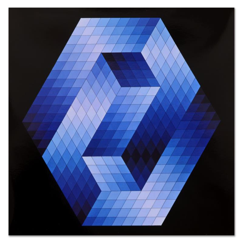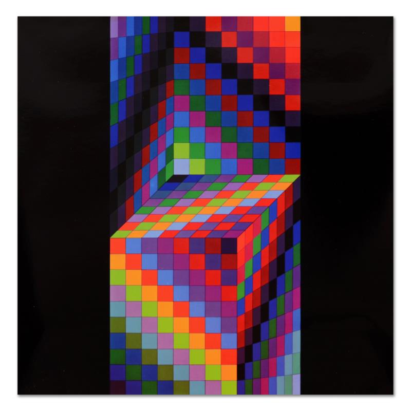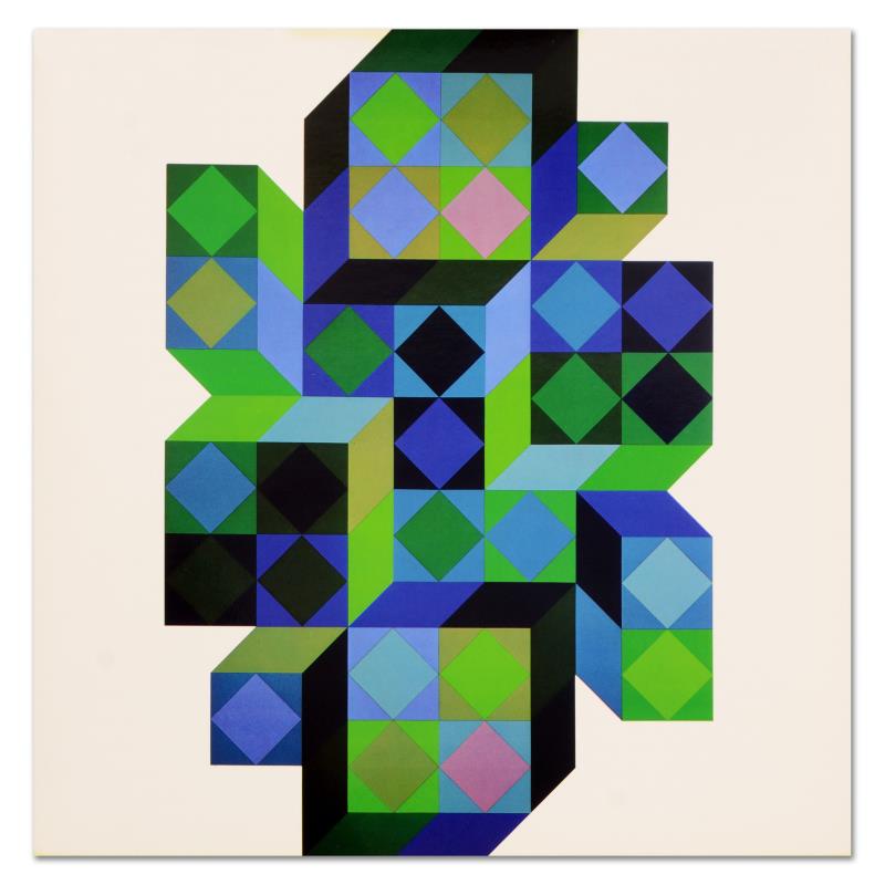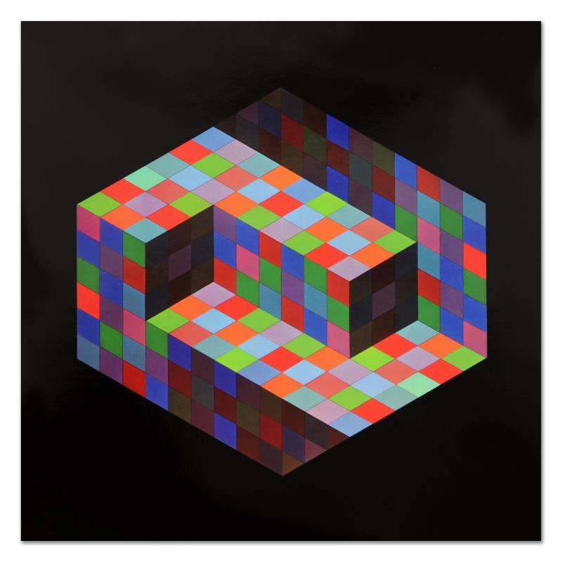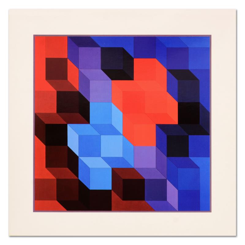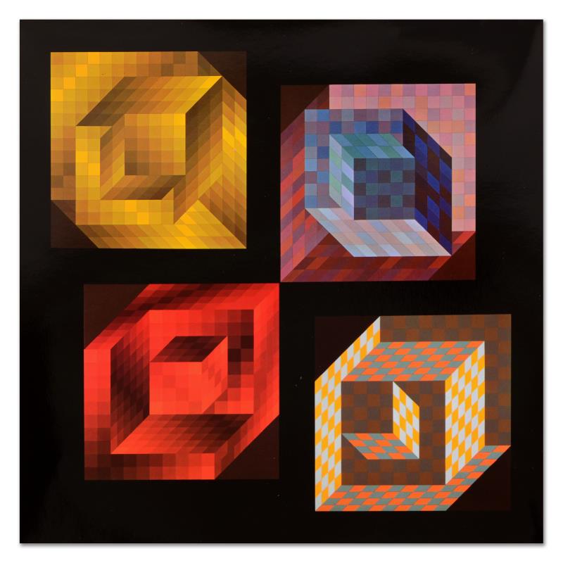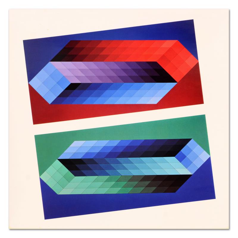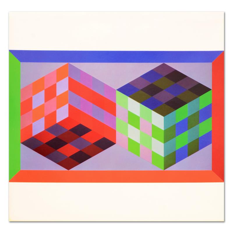 "Hommage Al'hexagone Portfolio" includes 10 heliogravure prints on paper from the Editions du Griffon (1971) by Victor Vasarely (1908-1997). Each piece is titled and dated inverso. Each Piece measures approx. 10.5" x 10.5" (image). ** Please note: there is a very faint hairline mark along the top of the first piece in this set that is only visible upon close inspection. **