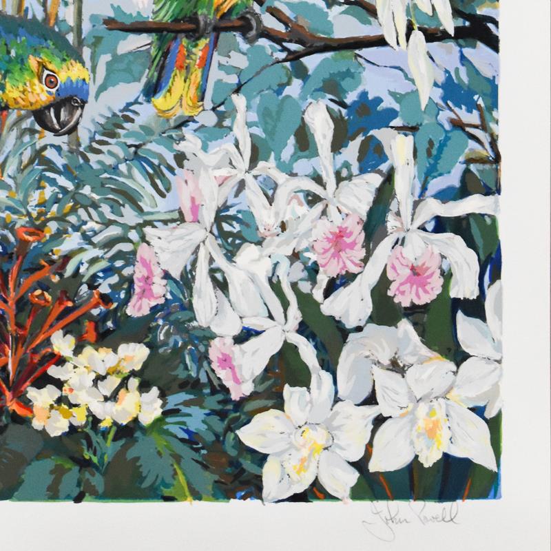 "Parrots & Hibiscus" is a limited edition serigraph on paper by John Powell, AP numbered 26/44 and hand signed by the artist. Includes Letter of Authenticity. Measures approx. 18" x 24" (border), 16" x 21" (image).