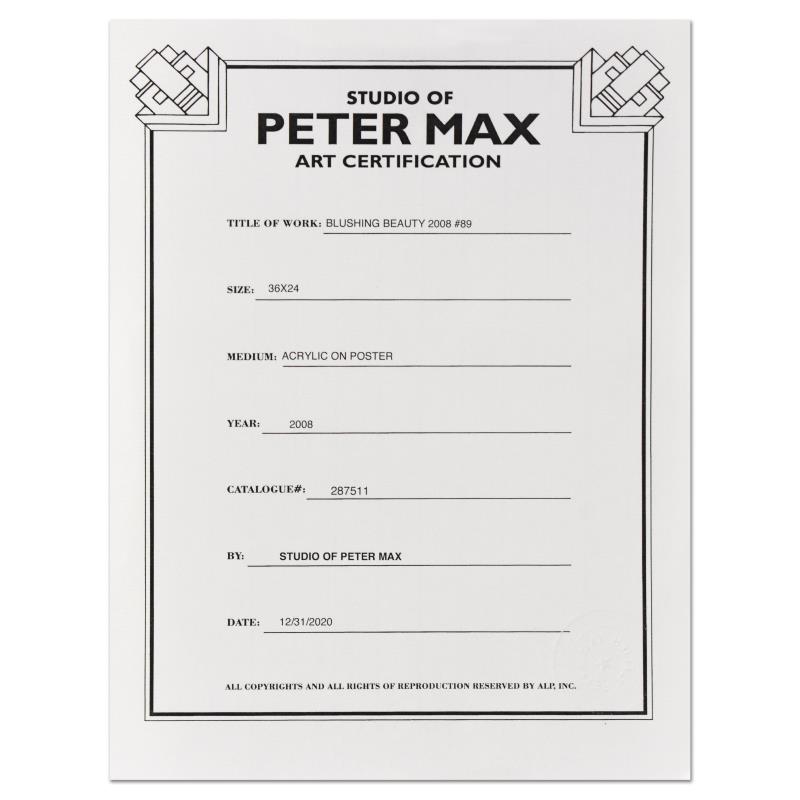 "Blushing Beauty" is a one-of-a-kind acrylic mixed media on paper, hand signed by Peter Max. This piece comes custom framed. Includes Certificate of Authenticity from Peter Max Studios. Measures approx. 34.5" x 46.5" (with frame), 23" x 35" (image).