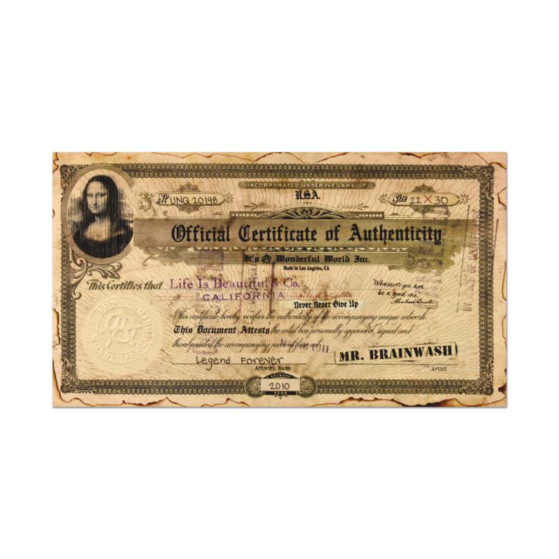 "Legend Forever" is a silkscreen overpaint on deckle edge paper by Mr. Brainwash, hand signed by the artist. This piece is numbered 1/1 and bears the thumbprint of the artist inverso. Includes Certificate of Authenticity. Measures approx. 30" x 22" (image).