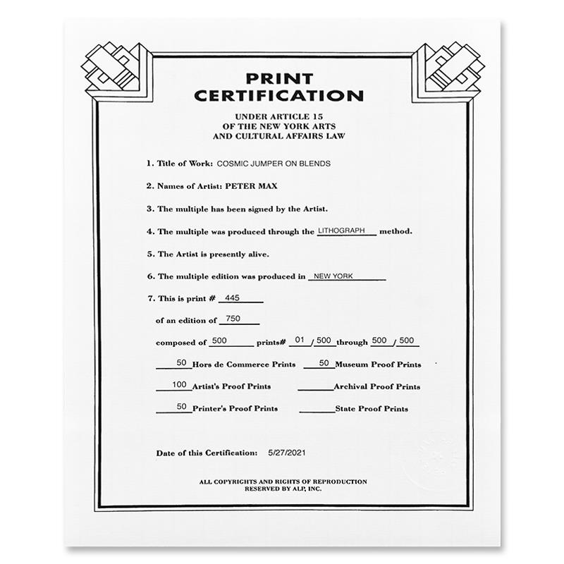 "Cosmic Jumper on Blends" is a limited edition lithograph on paper by Peter Max, numbered 445/500 and hand signed by the artist. This piece comes framed. Includes Certificate of Authenticity from Peter Max Studios. Measures approximately 28" x 32" (frame), 13" x 17" (image).