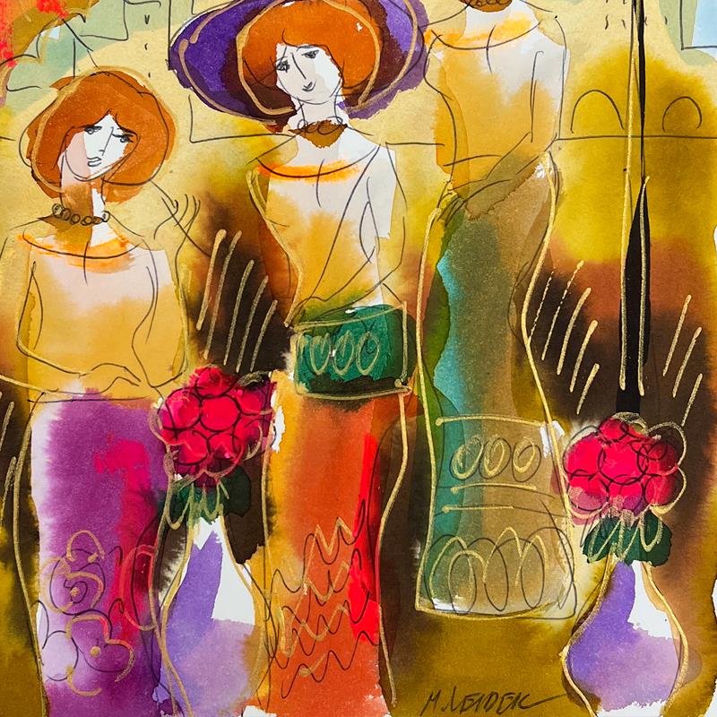 Leider often paints with water colors, acrylics and mixed media. Moshe’s works are harmonious and multicolored pleasing backdrops, often featuring chic women posing with parasols and wearing large brimmed hats.