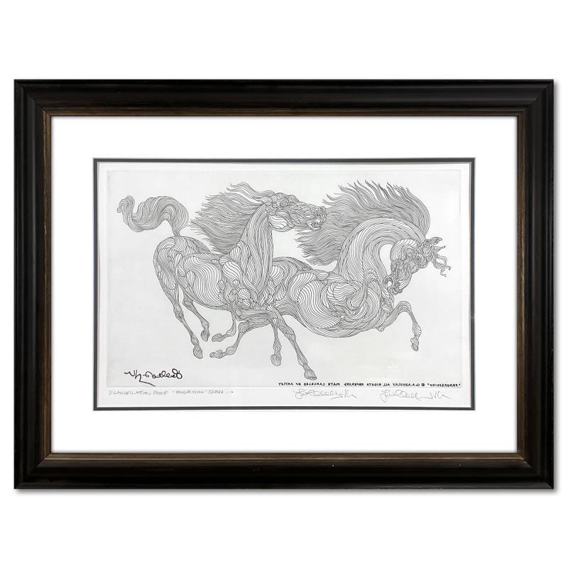 "Progression" is a one-of-a-kind cancellation proof with its corresponding copper plate by Guillaume Azoulay. The etching is numbered 1/1 and hand signed by the artist. Includes Letter of Authenticity. Each piece measures approx. 33" x 25" (frame), 22.5" x 14.5" (image).