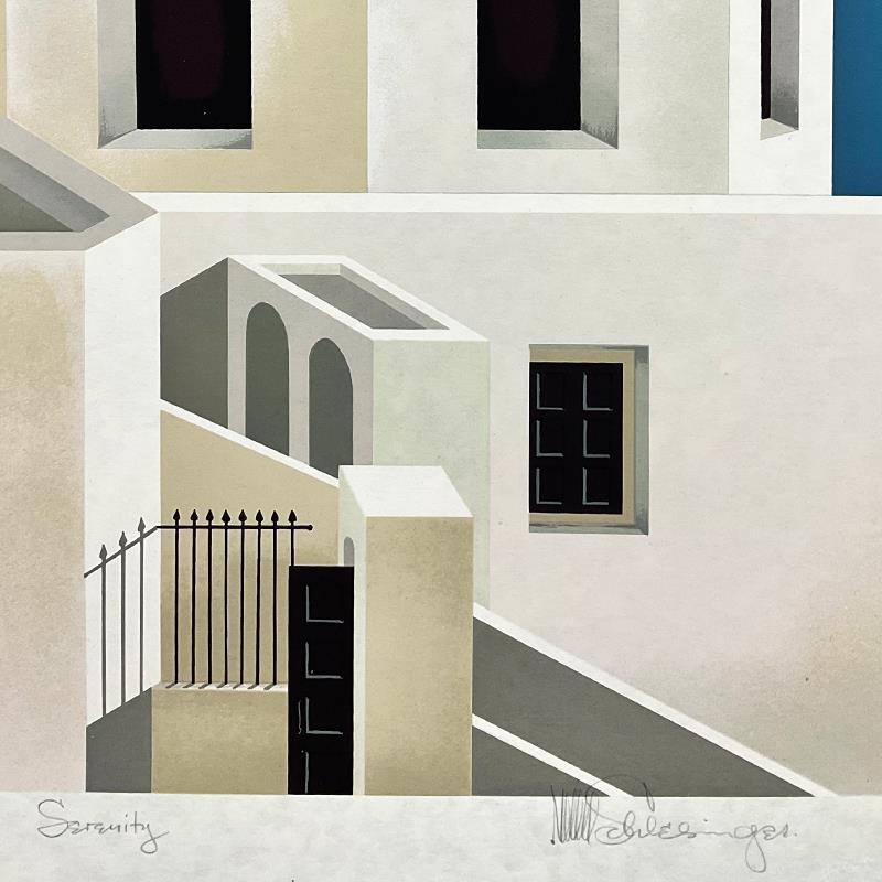 "Serenity" is a limited edition serigraph on paper by William Schlesinger (1915-2011), numbered 121/195 and hand signed by the artist. Includes Letter of Authenticity. Measures approx. 25" x 26" (border), 23" x 23" (image). Please note: On the reverse side of the paper, here are small patches in the border area where the top-layer of the paper has been torn off (likely from tape being removed).