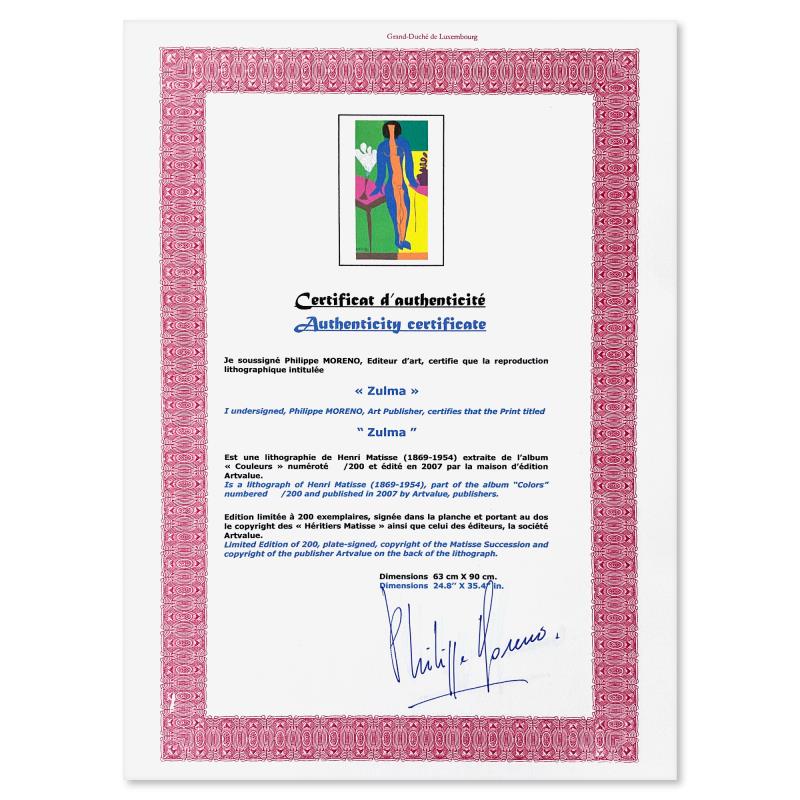 "Zulma" is a limited edition lithograph by Henri Matisse (1869-1954) bearing the plate signature of the artist. This piece comes from an edition of 200 authorized by the Matisse Estate; the edition number is not on the piece itself but on the certificate. This piece comes custom framed. Includes Certificate of Authenticity. Measures approx. 31" x 41.5" (frame), 25" x 35.5" (image).