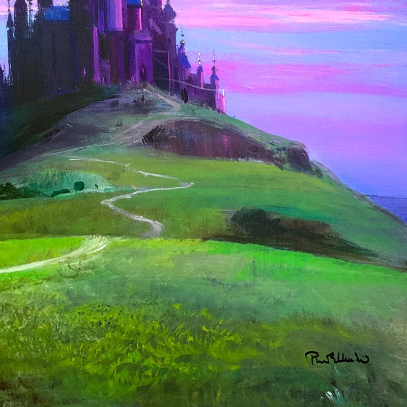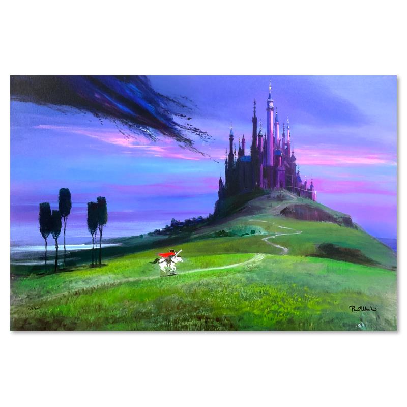 "Aurora's Rescue" is a limited edition giclee on stretched canvas, numbered 143/300 and hand signed by Peter Ellenshaw (1913-2007). This piece is licensed by Disney Fine Art. Includes Letter of Authenticity. Measures approx. 36" x 24" (image). There are scuffs on the castle that are only noticeable upon close inspection.