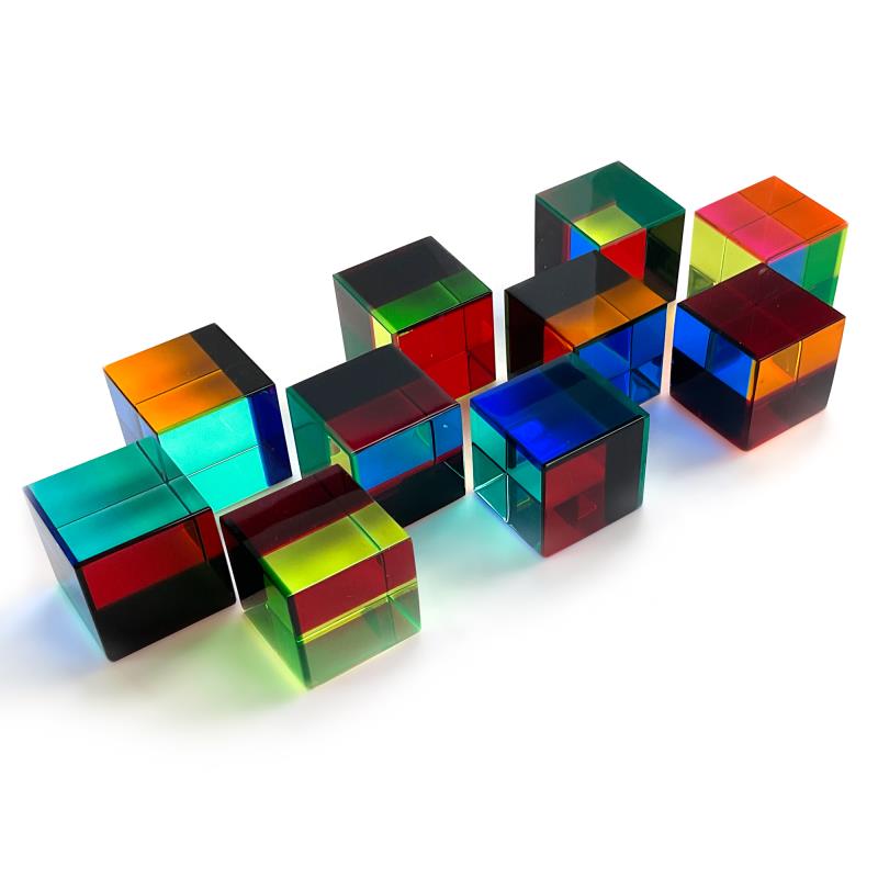 This is a prismatic acrylic cube sculpture (set of 10) by Vasa. One of the cubes in this set is hand signed by the artist. Includes Letter of Authenticity. Each cube measures approx. 2" x 2" x 2".