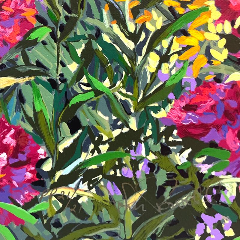 Canvas works are typically framed without plexi so that the vibrancy and interaction with light can be best appreciated.