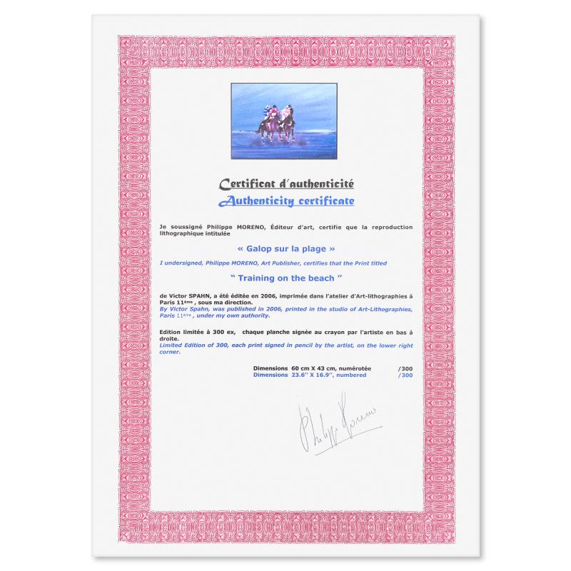 "Training on the beach" is a limited edition lithograph on paper by Victor Spahn. Printed at Art-Lithographies workshop in Paris, the piece is hand signed by the artist and comes with a certificate of authenticity. This piece is custom framed. Measures approximately 25" x 31.5" (frame), 17" x 23.5" (image).