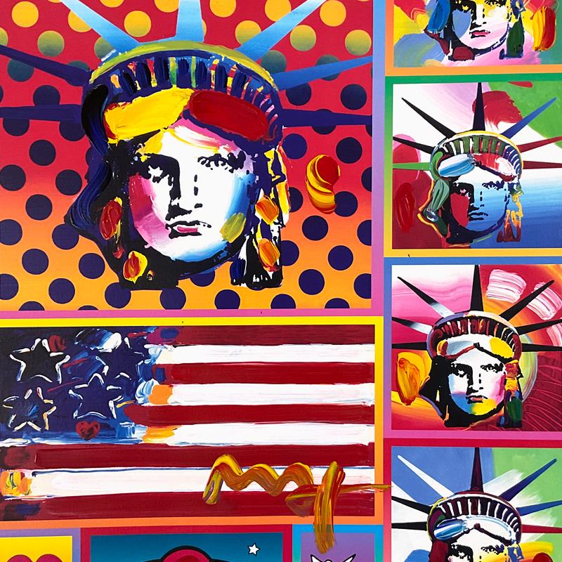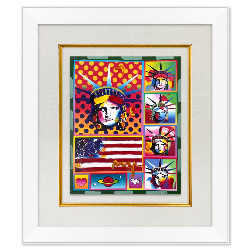 Peter Max, "5 Liberty and Flag" Framed One-of-a-Kind Acrylic Mixed Media, Hand Signed with Registration Number Certifying Authenticity