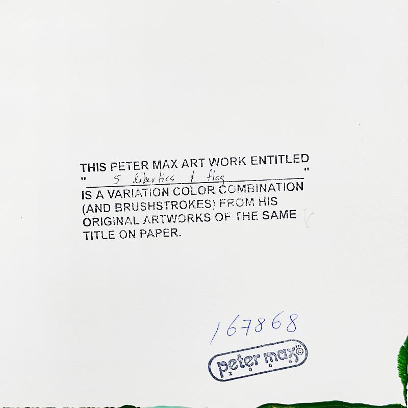 "5 Liberty and Flag" is a one-of-a-kind acrylic mixed media on paper, hand signed by Peter Max. The piece comes custom framed with a backside cutout to display Peter Max Studio registration number 167868 certifying authenticity. Measures approx. 28" x 24" (frame), 19" x 15" (image).