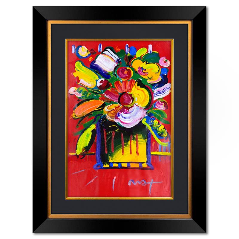 "Abstract Flower" is a one-of-a-kind mixed media on paper, hand signed by Peter Max. The piece comes custom framed with a backside cutout to display Peter Max Studio registration number 288154 certifying authenticity. Measures approximately 48" x 36" (frame), 36" x 24" (image). This item requires special handling and may have a longer than usual turnaround.