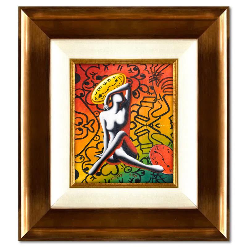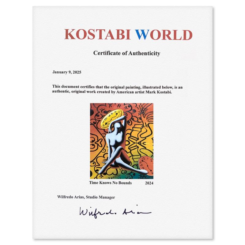 "Time Knows No Bounds"is an original oil painting on canvas by Mark Kostabi, hand signed by the artist. This piece comes custom framed. Includes Certificate of Authenticity. Measures approx. 22" x 20" (frame), 12" x 10" (image). This item requires special handling and may have a longer than usual turnaround.