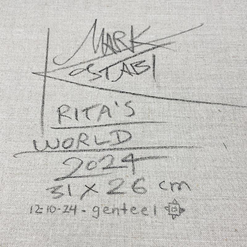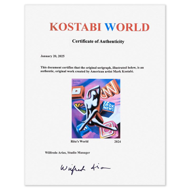 "Rita's World"is an original oil painting on canvas by Mark Kostabi, hand signed by the artist. This piece comes custom framed. Includes Certificate of Authenticity. Measures approx. 22" x 20" (frame), 12" x 10" (image). This item requires special handling and may have a longer than usual turnaround.