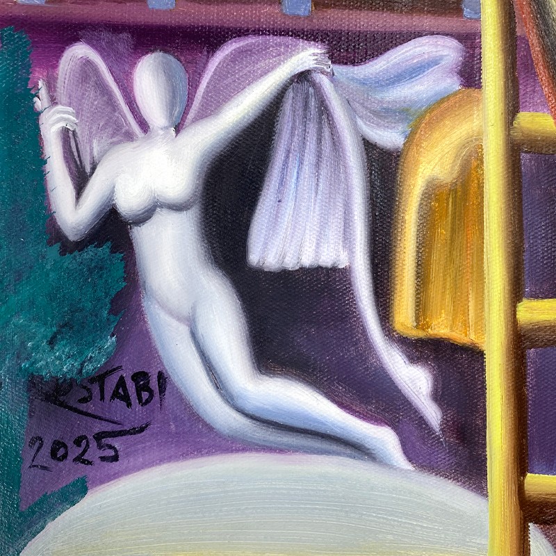 "Shifting" is an original oil painting on canvas by Mark Kostabi, hand signed by the artist. This piece comes custom framed. Includes Certificate of Authenticity. Measures approx. 34" x 28" (frame), 24" x 18" (image).