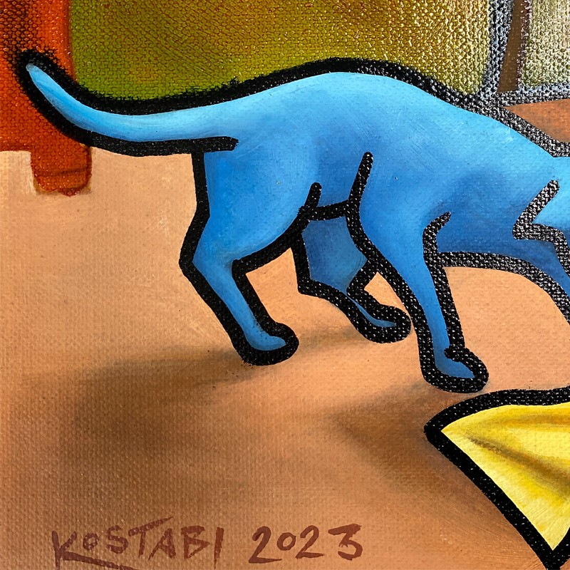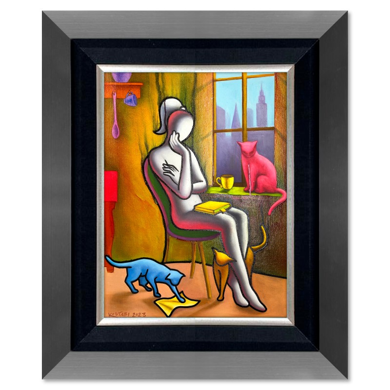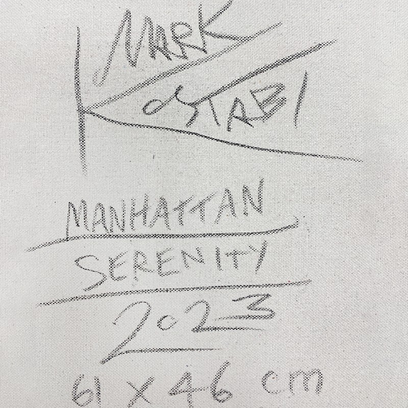 "Manhattan Serenity" is an original oil painting on canvas by Mark Kostabi, hand signed by the artist. This piece comes custom framed. Includes Certificate of Authenticity. Measures approx. 30" x 30" (frame), 20" x 20" (image).
