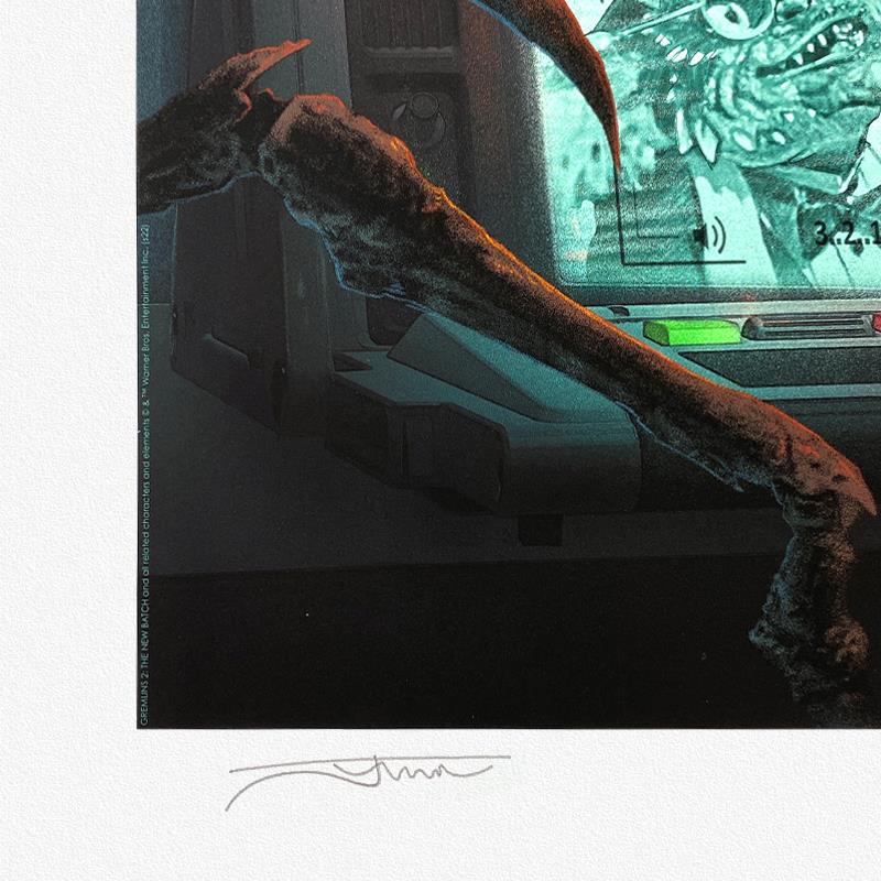 "Gremlins: The New Batch" is a limited edition giclee on paper by Juan Ramos, PP numbered 3/4 and bearing the authorized signature of the artist. Includes Letter of Authenticity. Measures approx. 18" x 24" (border) 14" x 20" (image).