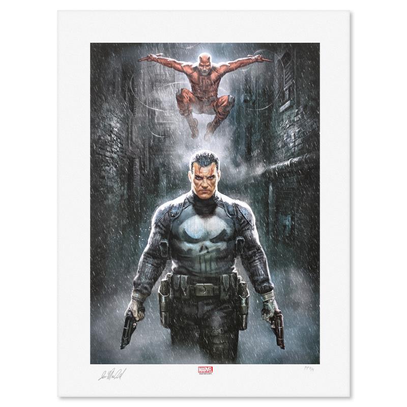 "Marvel Knights Punisher Daredevil" is a limited edition giclee on paper from Marvel Comics and Ian MacDonald, PP numbered 3/4 and bearing the authorized signature of the artist. Includes Letter of Authenticity. Measures approx. 24" x 18" (border) 20" x 14" (image).