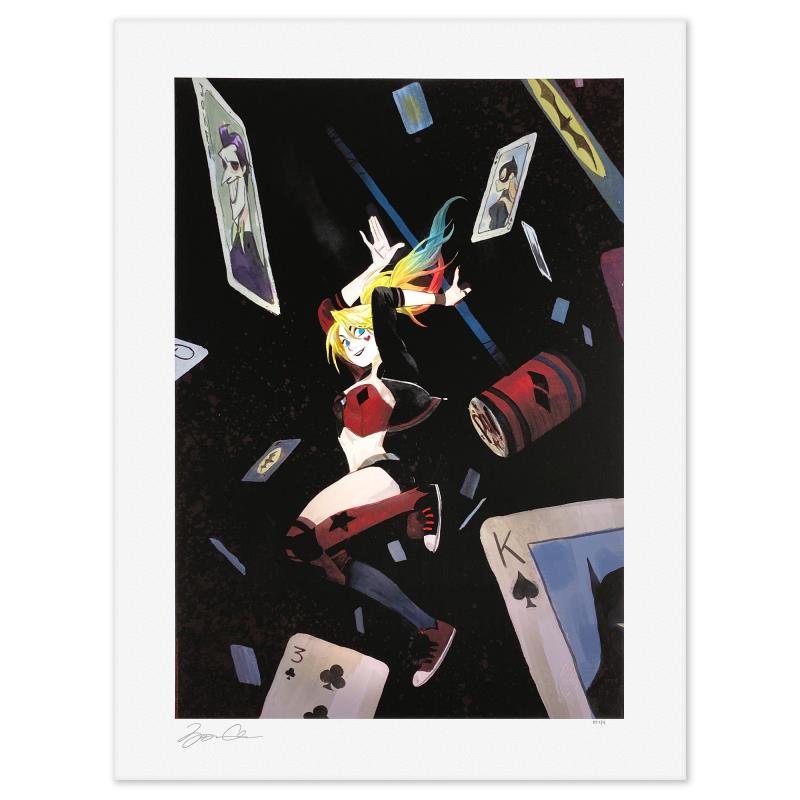 "Harley Quinn: Red Flags" is a limited edition giclee on paper from DC Comics and Mingjue Helen Chen, PP numbered 3/4 and bearing the authorized signature of the artist. Includes Letter of Authenticity. Measures approx. 24" x 18" (border) 20" x 14" (image).