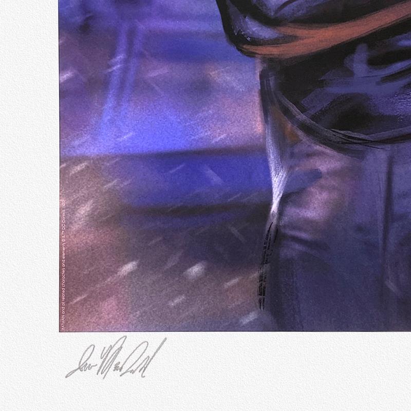 "Catwoman #21" is a limited edition giclee on paper from DC Comics and Ian MacDonald, PP numbered 3/4 and bearing the authorized signature of the artist. Includes Letter of Authenticity. Measures approx. 24" x 18" (border) 20" x 14" (image).