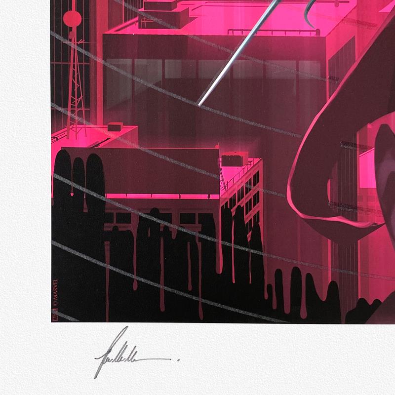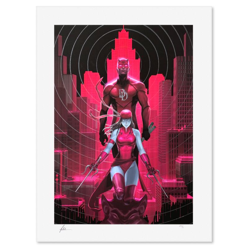 "Daredevil and Elektra" is a limited edition giclee on paper from Marvel Comics and Hoi Mun Tham, PP numbered 3/4 and bearing the authorized signature of the artist. Includes Letter of Authenticity. Measures approx. 24" x 18" (border) 20" x 14" (image).