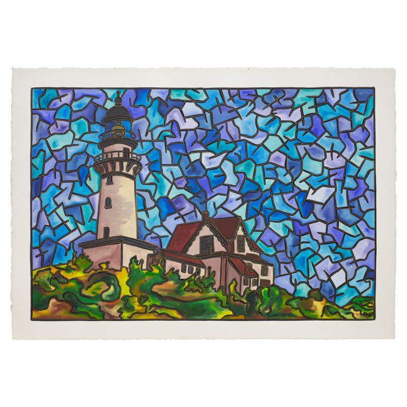 "New England Lighthouse" is an original painting, gouache on Bristol board by Alex Echo. Hand signed and accompanied by a letter of authenticity. Measures approximately 26" x 16".