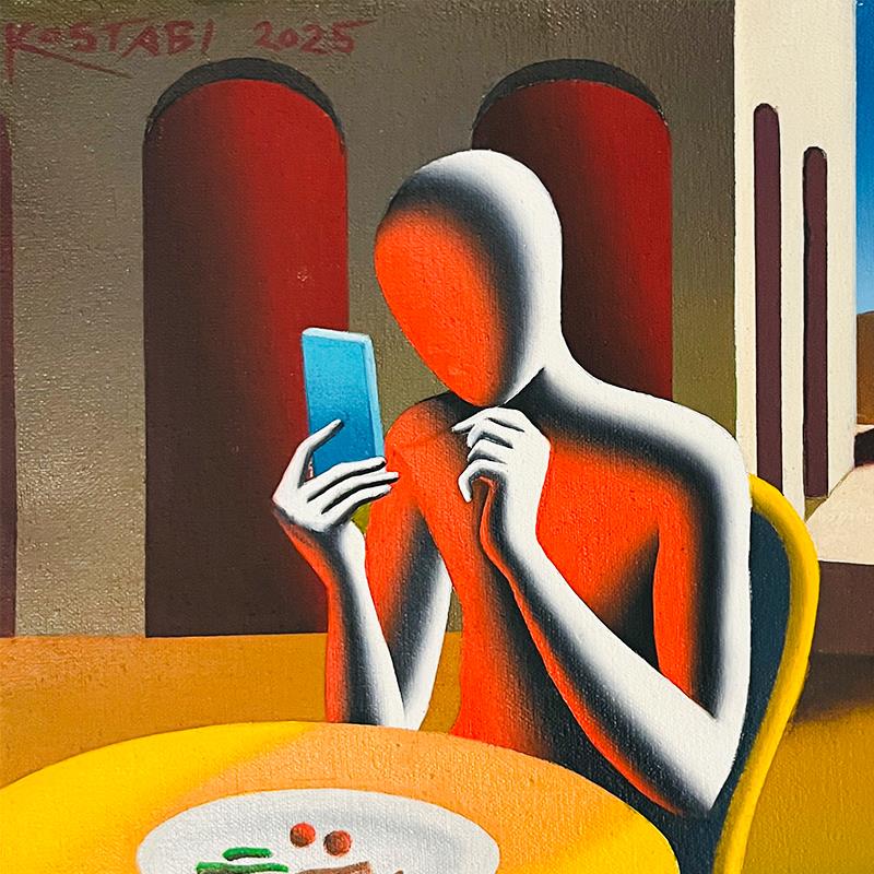 Mark Kostabi, Framed Original Oil Painting on Canvas, Hand Signed with a Certificate of Authenticity.