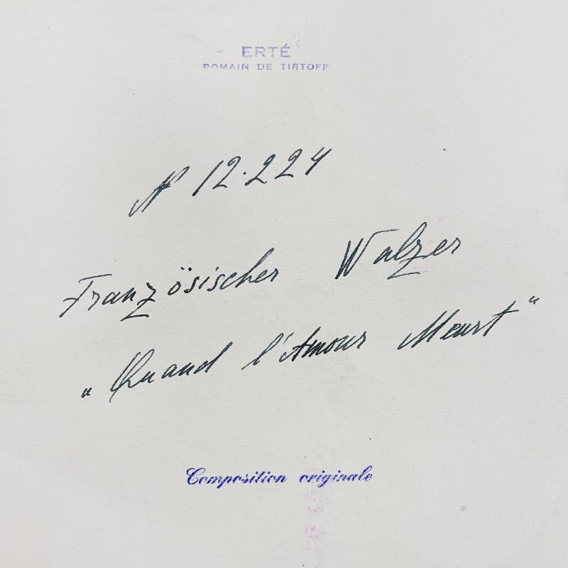 "Franzosischer Walter quand l'amour meurt, December 19, 1951" is an original gouache painting on paper by Erte (1892-1990), hand signed by the artist. Includes Letter of Authenticity. Measures approx. 14.5" x 10.5" (image).