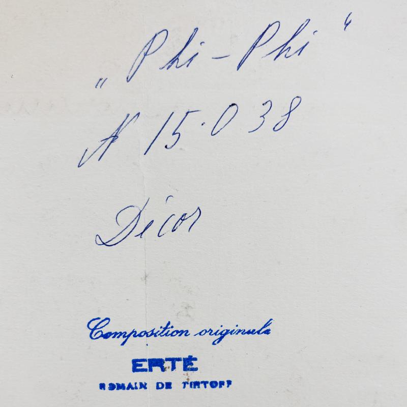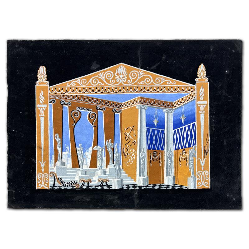 Erte (1892-1990), "Phi-Phi, Decor Fait pour les Bouffes-Parisiens, 17 Mars 1957" Original Gouache Painting, Hand Signed with Letter of Authenticity.