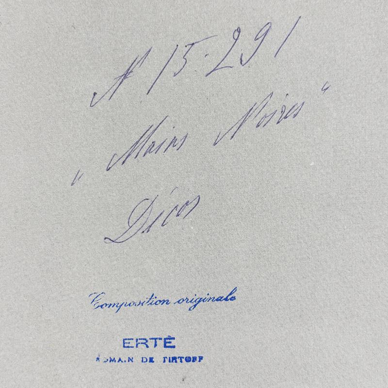 "Mains Noires, Decor, 16 Janvier 1958" is an original gouache painting on paper by Erte (1892-1990), hand signed by the artist. Includes Letter of Authenticity. Measures approx. 10" x 13" (border), 6.5" x 8" (image).There is a crease on the top-right border that ay be cropped when the piece is framed.