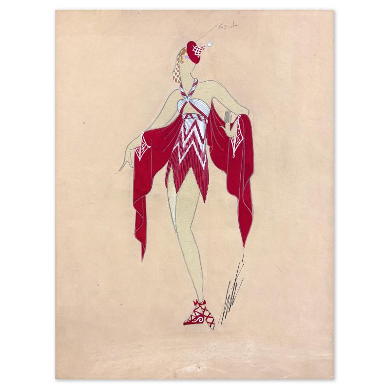Born in St. Petersburg in 1892, and expected by his father to follow a military career, Erte confounded the Russian Fleet Admiral by creating his first successful costume design at the age of five. Not until he was 20 years old was Erte finally allowed to move to Paris in 1912 to pursue his passion for fashion. Erte enjoyed a long career as a fashion illustrator for Harper's Bazaar magazine, and gained fame as the creator of gloriously extravagant costumes and stage sets for the Folies Bergere in Paris, and for George White's Scandals in New York. He also designed for the opera and traditional theatre, and made a brief appearance on the Hollywood scene in 1925.