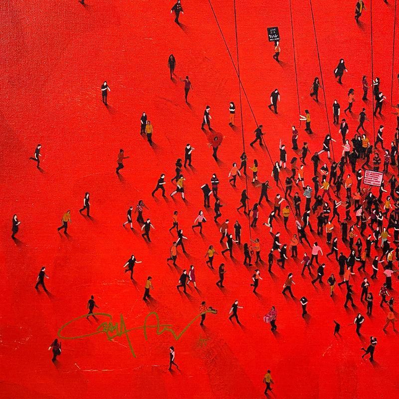One of Alan’s notable series, "Populus," features intricate paintings of tiny people forming iconic images. This work showcases characters from diverse walks of life, demonstrating a broad spectrum of character and body types through brilliant use of posture and movement. The figures in Alan’s "Populus" series are meticulously arranged to create larger, recognizable images, highlighting his inventive approach and the thematic exploration of individual versus collective identity.
