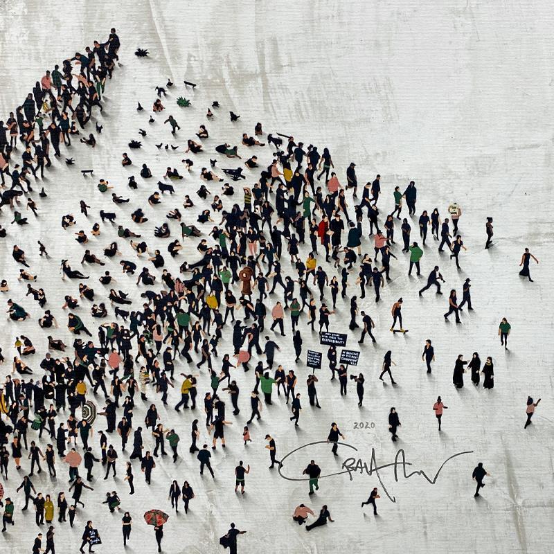 One of Alan’s notable series, "Populus," features intricate paintings of tiny people forming iconic images. This work showcases characters from diverse walks of life, demonstrating a broad spectrum of character and body types through brilliant use of posture and movement. The figures in Alan’s "Populus" series are meticulously arranged to create larger, recognizable images, highlighting his inventive approach and the thematic exploration of individual versus collective identity.