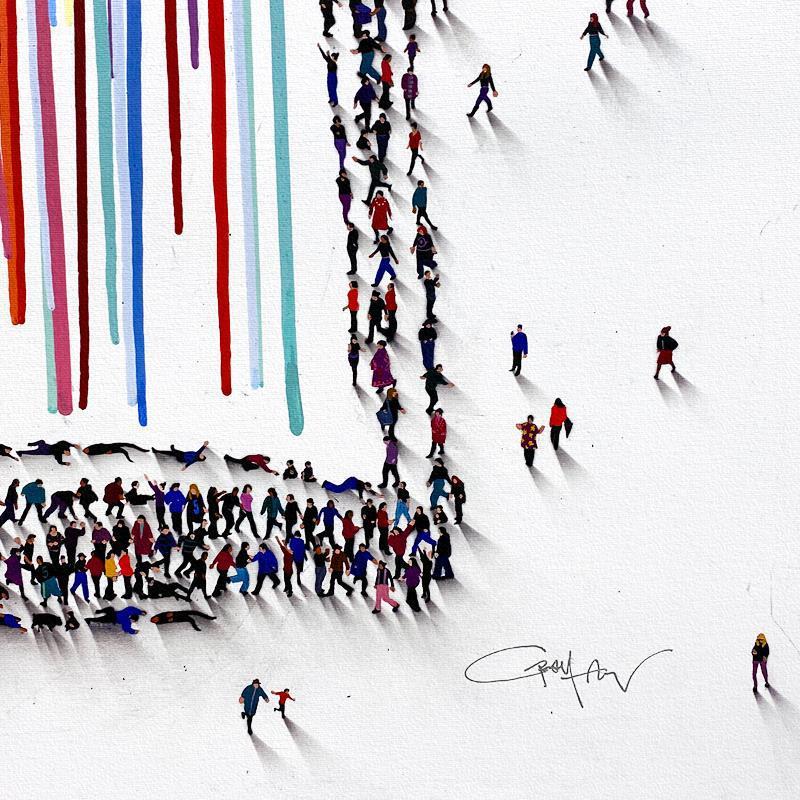 One of Alan’s notable series, "Populus," features intricate paintings of tiny people forming iconic images. This work showcases characters from diverse walks of life, demonstrating a broad spectrum of character and body types through brilliant use of posture and movement. The figures in Alan’s "Populus" series are meticulously arranged to create larger, recognizable images, highlighting his inventive approach and the thematic exploration of individual versus collective identity.