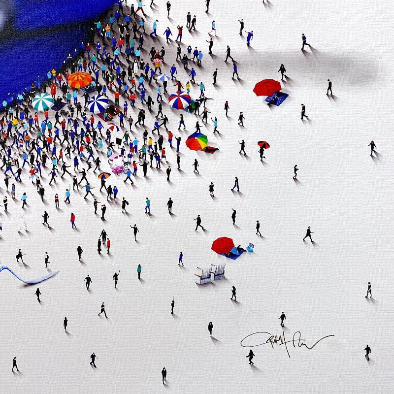 One of Alan’s notable series, "Populus," features intricate paintings of tiny people forming iconic images. This work showcases characters from diverse walks of life, demonstrating a broad spectrum of character and body types through brilliant use of posture and movement. The figures in Alan’s "Populus" series are meticulously arranged to create larger, recognizable images, highlighting his inventive approach and the thematic exploration of individual versus collective identity.