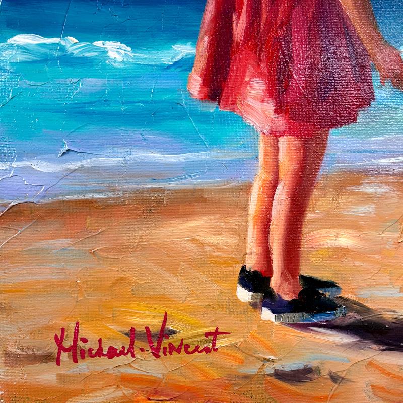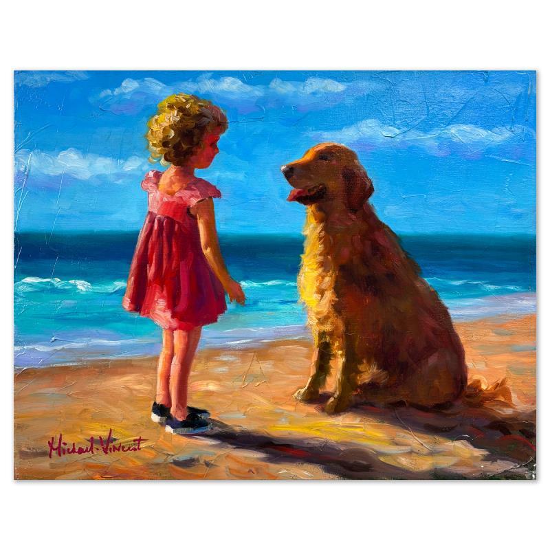 "Can I Tell You a Secret" is an original painting on stretched canvas by Michael Vincent, hand signed by the artist. Includes Letter of Authenticity. Measures approx. 16" x 20" (image).