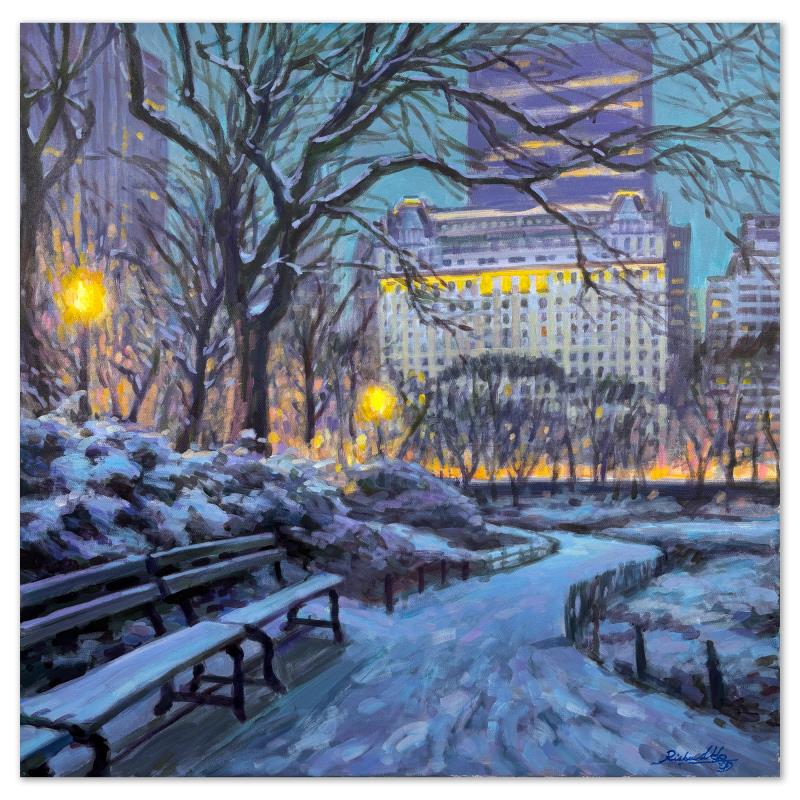 "At the Plaza, Winter" is an original acrylic painting on stretched canvas by Richard Ho, hand signed by the artist. Includes Letter of Authenticity. Measures approx. 30" x 30" (image).