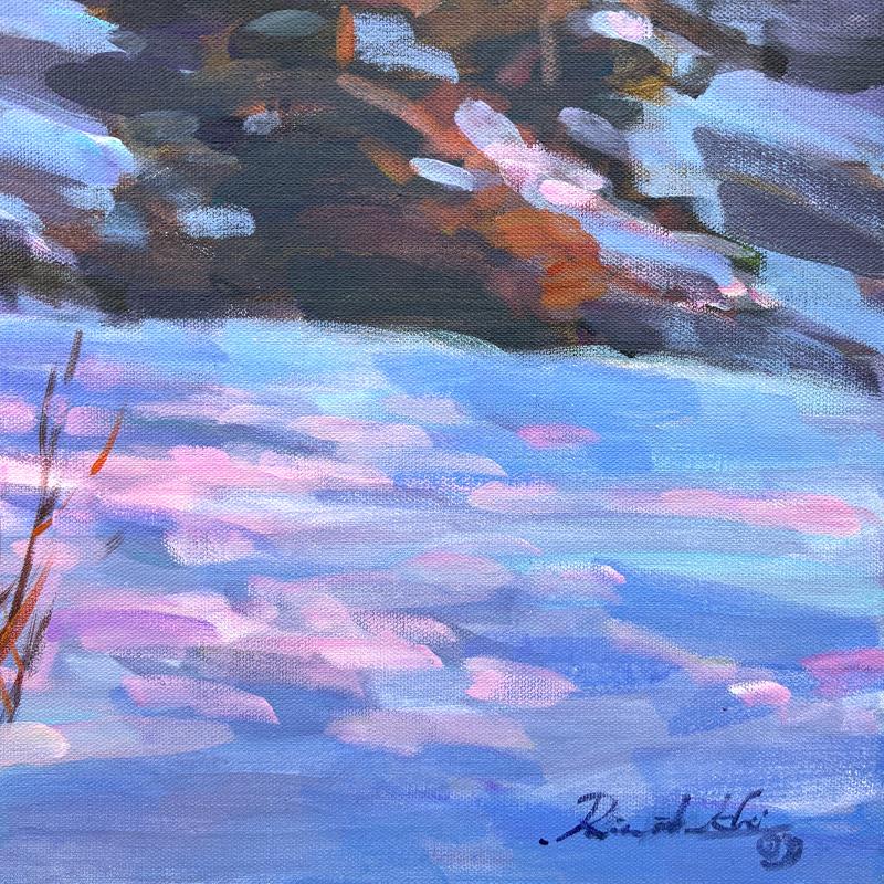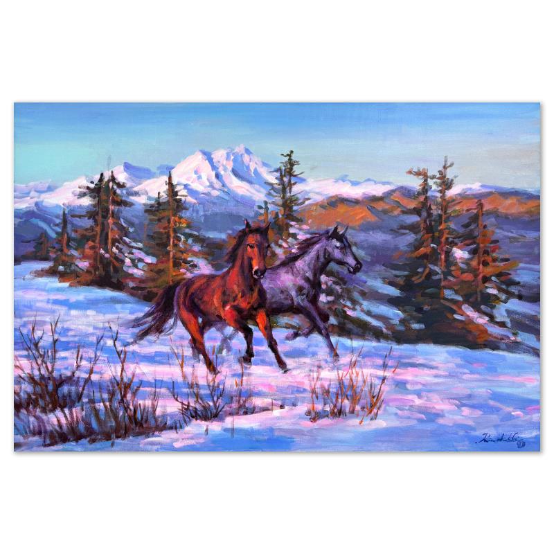 "Winter Run" is an original acrylic painting on stretched canvas by Richard Ho, hand signed by the artist. Includes Letter of Authenticity. Measures approx. 24" x 36" (image).