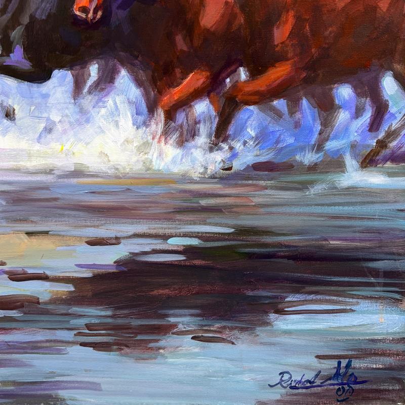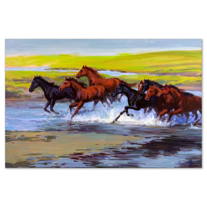 "Stampede" is an original acrylic painting on stretched canvas by Richard Ho, hand signed by the artist. Includes Letter of Authenticity. Measures approx. 24" x 36" (image).