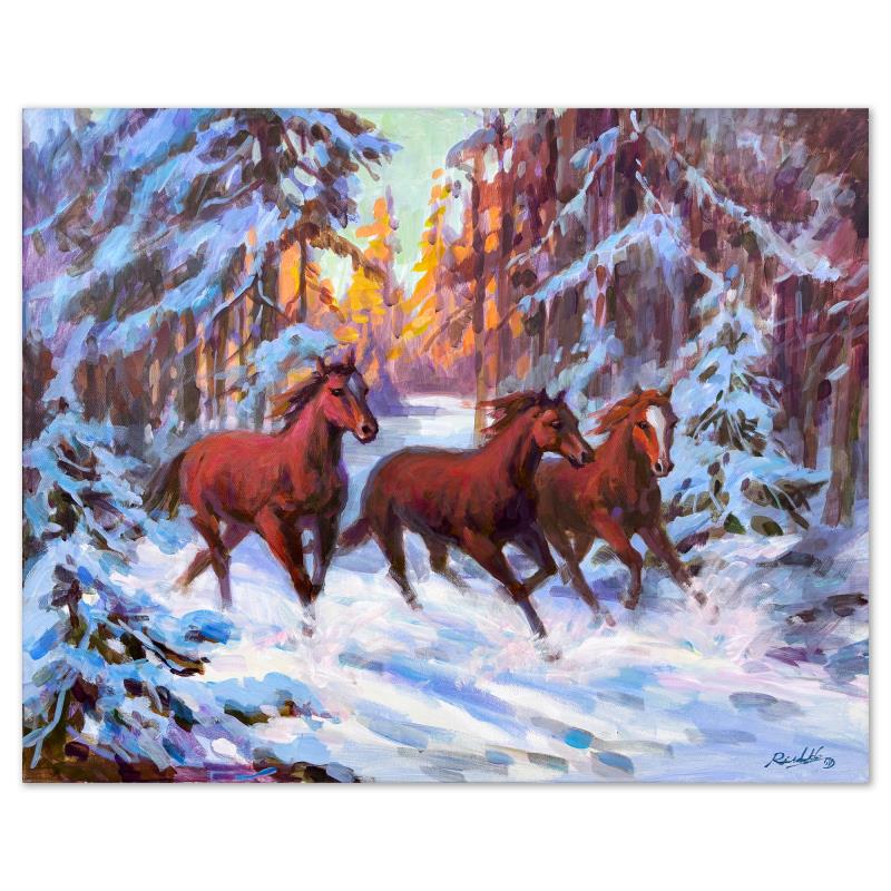"Three Yearlings" is an original acrylic painting on stretched canvas by Richard Ho, hand signed by the artist. Includes Letter of Authenticity. Measures approx. 24" x 30" (image).