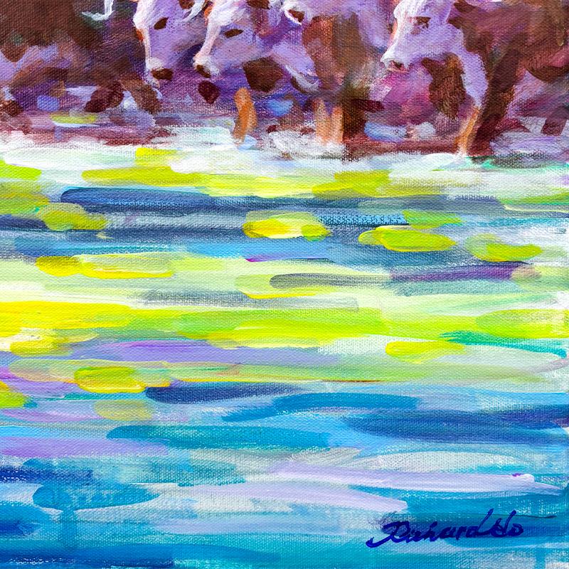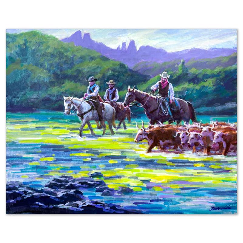 "Cattle Crossing" is an original acrylic painting on stretched canvas by Richard Ho, hand signed by the artist. Includes Letter of Authenticity. Measures approx. 24" x 30" (image).