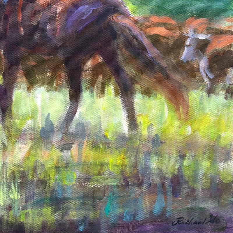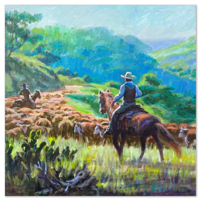 "Head 'em Up" is an original acrylic painting on stretched canvas by Richard Ho, hand signed by the artist. Includes Letter of Authenticity. Measures approx. 24" x 24" (image).